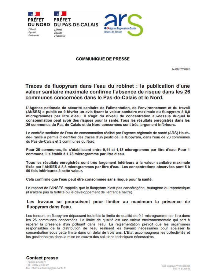 L'Agence Nationale de Sécurité Sanitaire (ANSES) a défini la valeur sanitaire maximale du fluorypam par litre d'eau. Le taux présent dans l'eau distribué dans la commune est 8 fois inférieur à la valeur fixée à 8,8 microgrammes.